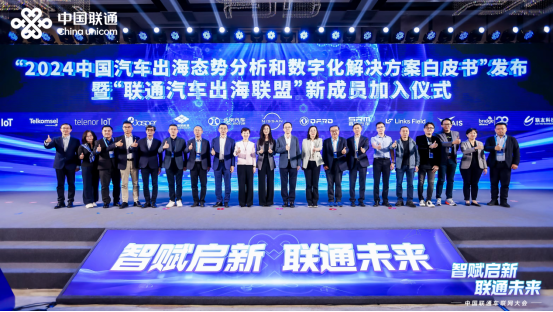 联通智网科技董事长赵越、联通国际公司董事长孟树森、联通研究院院长李红五、联通集团政企BG副总裁梁鹏、联通汽车制造军团军团长周华与东风日产、北汽股份、东风研发总院、五菱新能源、鑫源汽车、Jasper、领科、挪威电信、泰国AIS、印尼Telkmsel 、桥联盟等共计15家海内外企业举行白皮书发布暨中国联通汽车出海联盟新成员加入仪式,持续扩大汽车出海力量,共促中国汽车产业全球化迈向新台阶。