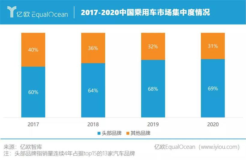 与此同时,中国汽车市场正式由增量市场向存量市场转变,所呈现的马太效应也愈发明显。据亿欧汽车观察,2020年中国乘用车市场集中度再度提升,销量连续4年占据top15的13家汽车品牌,市占率高达69%,留给剩余近百家车企的市场空间仅有31%。可以说,一场战况激烈的汽车品牌淘汰赛正在如火如荼地进行中。如何靠品牌侵占汽车用户心智?这是一道令车企绞尽脑汁的问题。