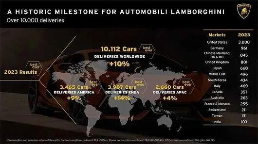 同样,兰博基尼也达到了一个历史性的里程碑。2023年,兰博基尼销量首次超过1万辆,共交付新车10,112辆,相比2022年的9,200辆有了大幅提升。其中,Urus交付6,087辆,Huracán交付了3,962辆,另外还有63辆搭载V12发动机的旗舰跑车。
