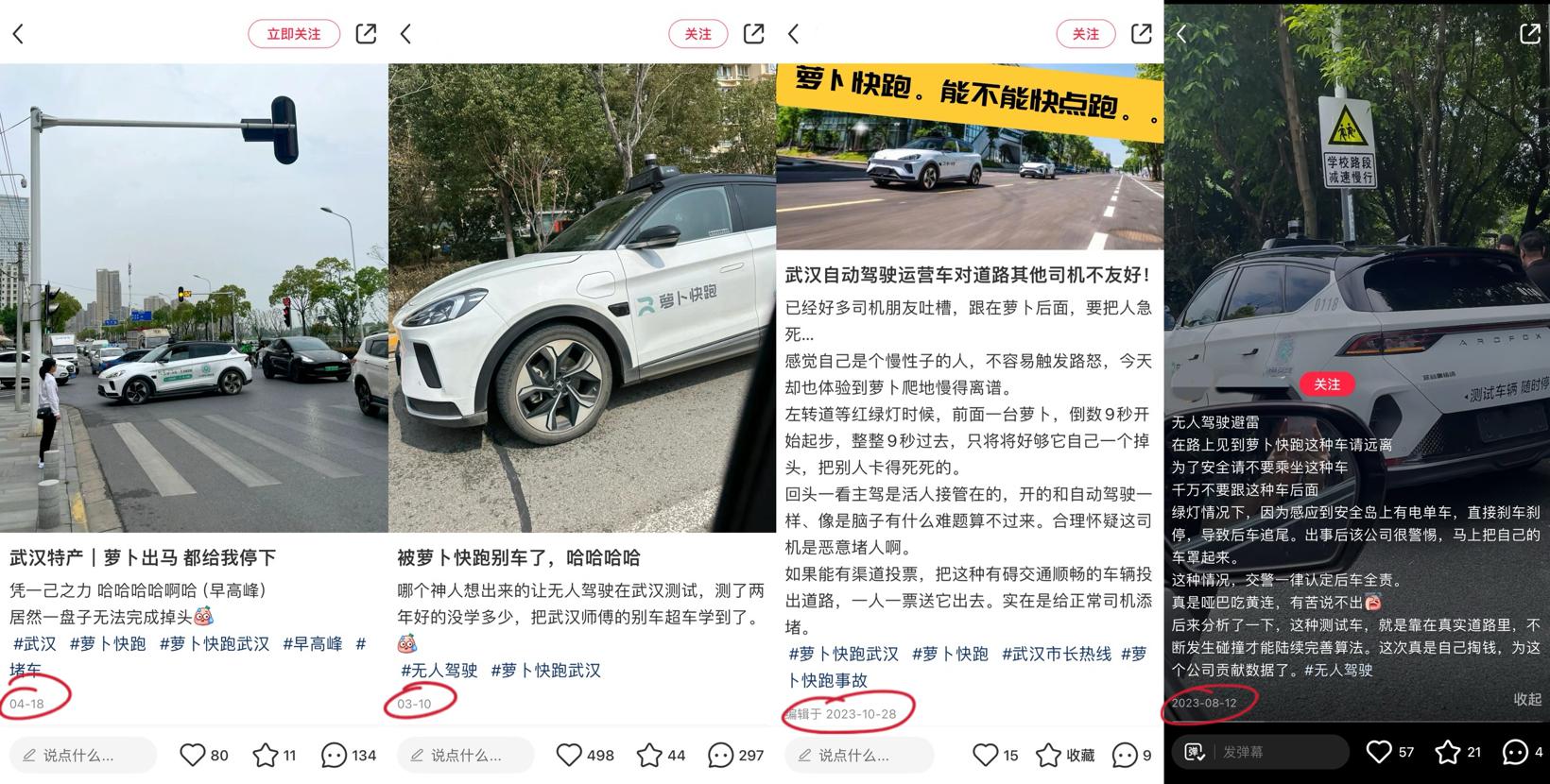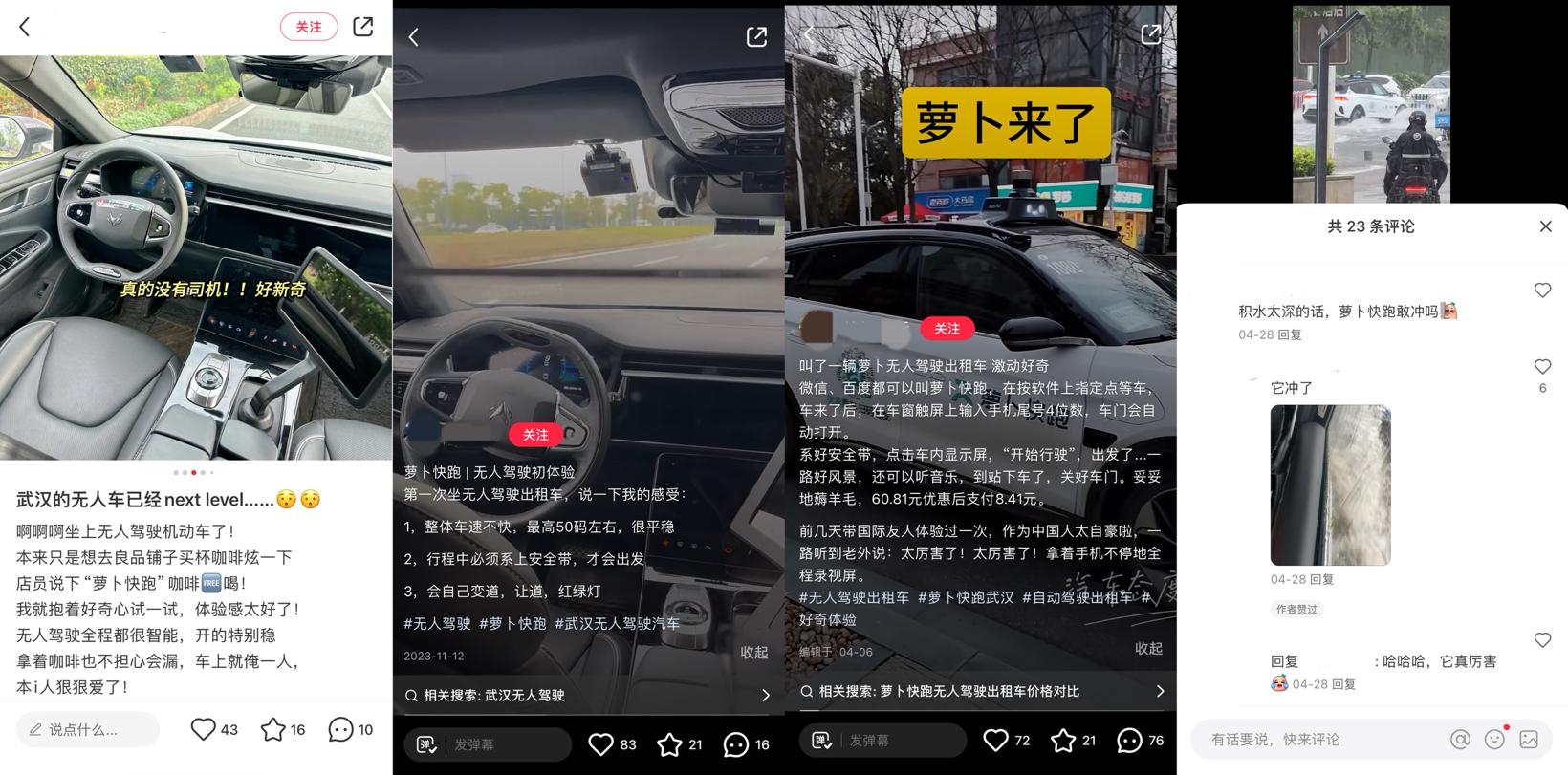 社交平台中对于武汉萝卜快跑的吐槽贴;图片来源:社交平台截图