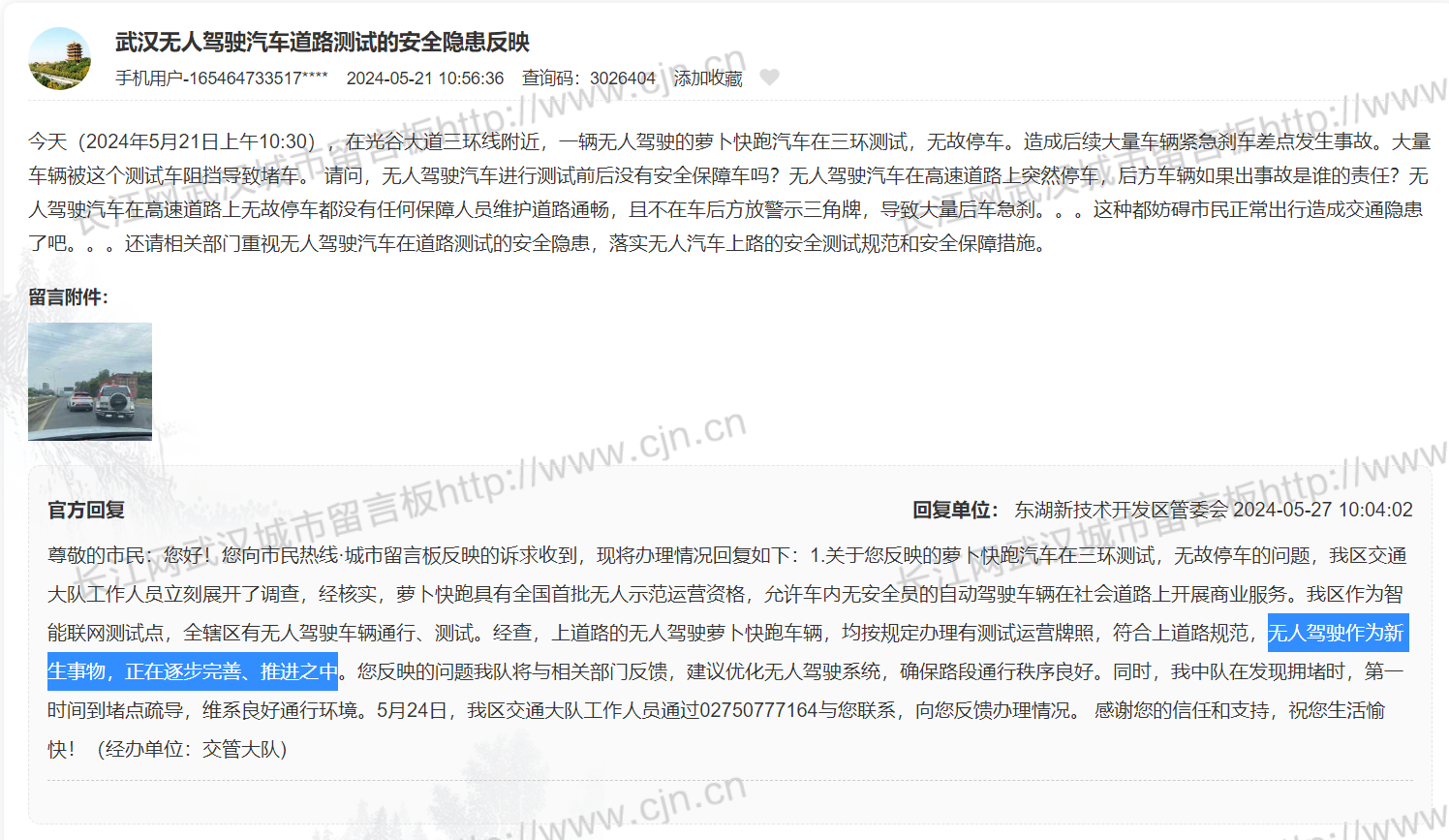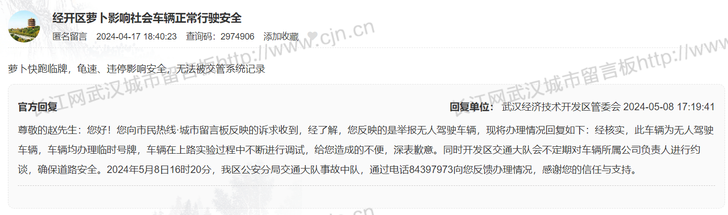 可就在众人为萝卜快跑一系列数据而欢呼时,网络上涌现“武汉萝卜快跑致拥堵遭大量投诉”的信息,并列举多个在武汉城市留言板上的留言,无外乎:无故停车导致交通拥堵和安全隐患,违规停车以及早晚高峰车速过慢等。
