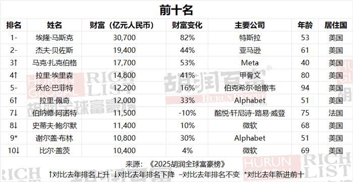 其中,53岁的埃隆·马斯克五年内第四次蝉联世界首富,并成为首位财富超过4000亿美元的个人。埃隆·马斯克的财富飙升了1.38万亿元或82%,达到3.07万亿元人民币,主要归功于特斯拉股价的“特朗普效应”。