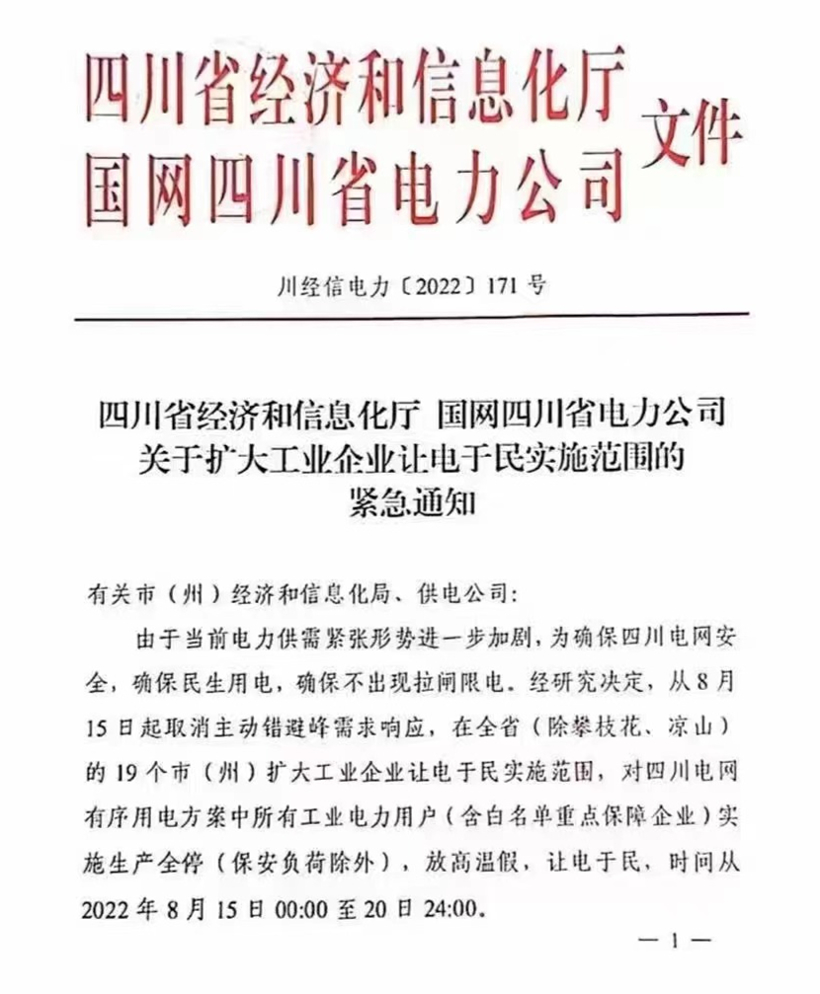 8月14日,为确保电网安全与民生用电,不出现拉闸限电情况 ,四川省经济和信息化厅和国网四川省电力公司联合发布《关于扩大工业企业让电于民实施范围的紧急通知》,要求所有工业用电企业(含白名单重点保障企业)生产全停6日, 时间从8月15日00:00至20日24:00。