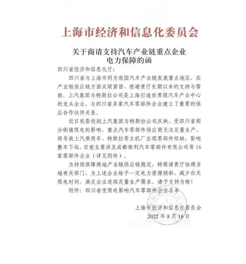 据悉,8月16日,上海市经信委向四川省经信厅发函,其中提到,近日收到了上汽集团和特斯拉公司反映,受四川省部分街镇限电影响,重点汽车零部件供应商无法足量生产,导致上汽乘用车、特斯拉等主机厂出现了零部件短缺,影响整车下线。为保障两地产业链供应稳定,特商请四川工信厅协调当地有关部门,为包括成都银利汽车零部件有限公司在内的16家企业倾斜一定的电力资源,减少白天的限电时间,满足企业连续足量生产需求。