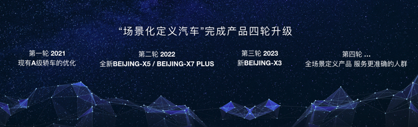 第四轮是全场景化产品。自2023年起,BEIJING汽车将为用户打造系列全场景化产品,服务更精准人群,例如为职场新生代、游戏发烧友、萌宠家长、全职妈妈等人群打造的产品,将为他们提供更独特的解决方案,带来个性化的用车体验。