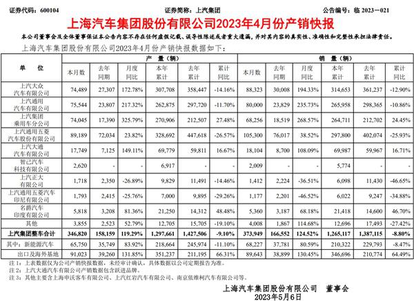 上汽集团4月销量同比劲增124.52%,前4月累销破百万辆