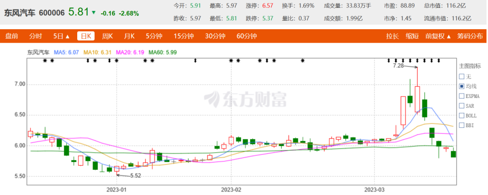 在东风汽车降价后的第一周,3月7日A股开盘,东风汽车直接直线拉升封涨停板,报收6.80元/股,简直气势如虹,一下扭转了开年后整整两个月的颓势。3月8日,东风汽车股价高开,最高涨至7.09元/股,后股价回落,报收6.70元/股。3月9日股价再次攀升,最高7.28元/股,收盘6.97元/股。就在所有人都以为东风汽车这一次能继续高开猛走的时候,接下来五天,东风股价骤降,一路吹绿灯,只在15日的时候有些微的回升。